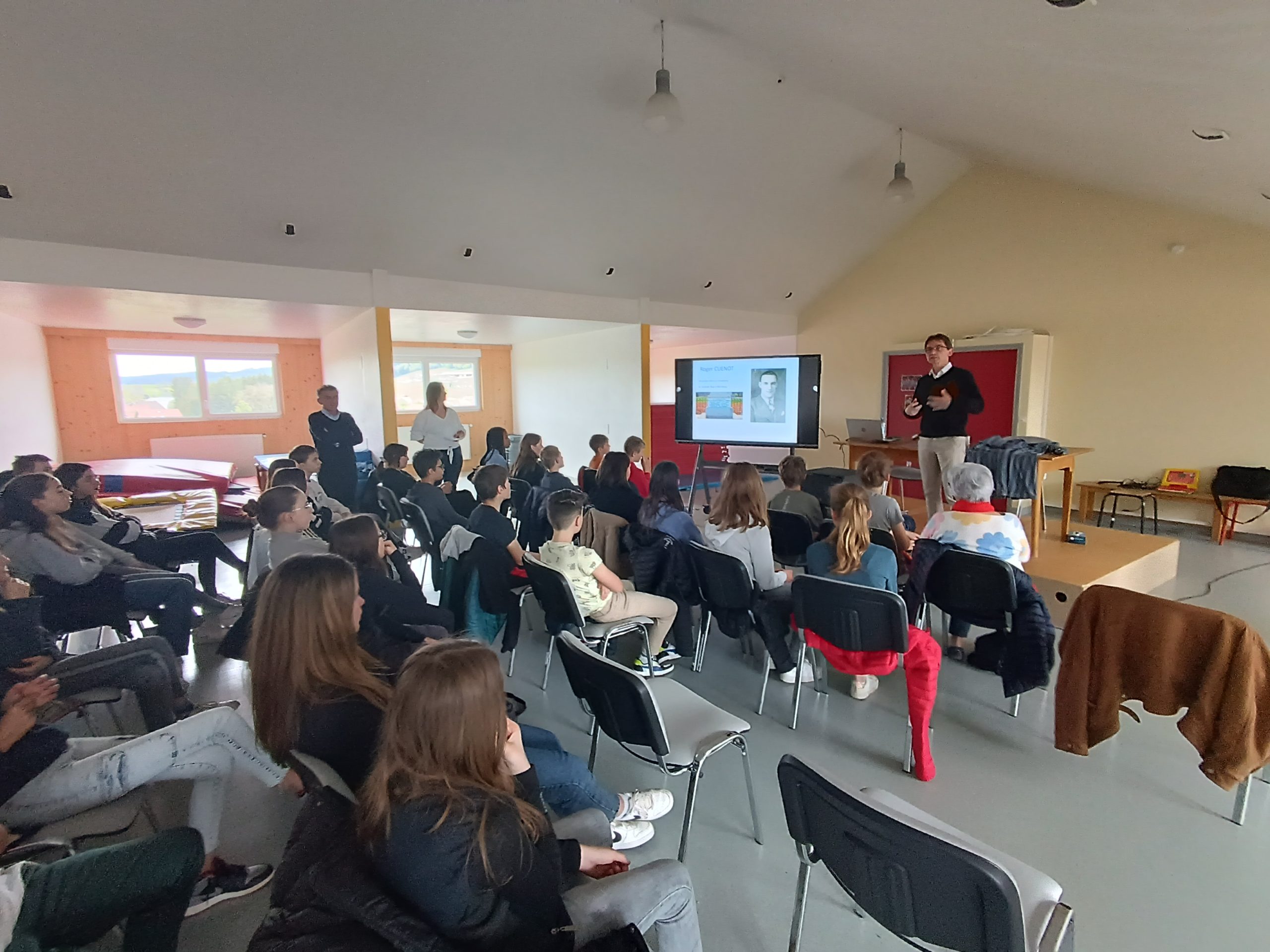 Mais avant celle-ci, M. Laurent Thiery a pu évoquer la fin de vie de Roger dans le camp de Dora à des élèves du Lycée de Morteau ainsi que du collège de l’Immaculée Conception du Russey.Enfin, plus de 80 personnes ont assisté à la conférence qui s’est déroulée à la salle des fêtes le mardi à 20h00